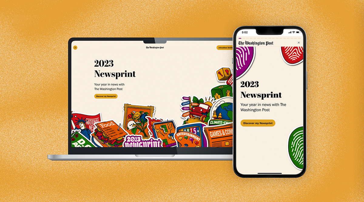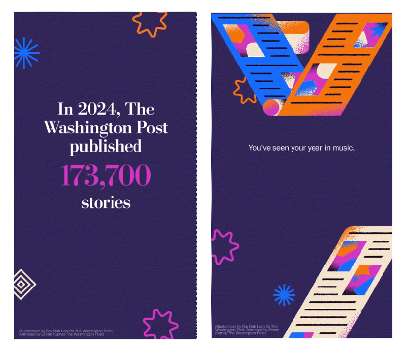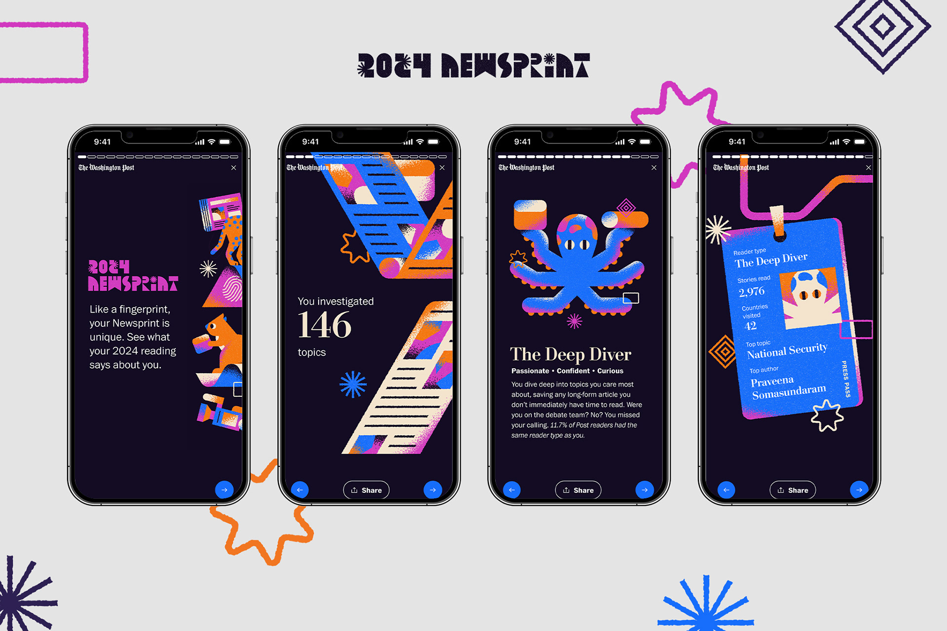 Since its inception in 2022, I've been a front-end designer and art director for Newsprint, the Washington Post's year-end review product. From the beginning, I've wanted the experience to be vibrant and sleek while still looking quintessentially Washington Post. This year, I commissioned artwork from Ray Dak Lam and animated the assets using Lottie to translate this style across all of our platforms.